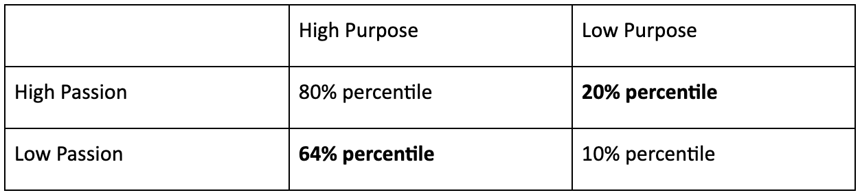 He established metrics to assess: sense of purpose, passion and performance of various individuals. The initial results are not surprising; individuals with both high passion for their work and a strong sense of purpose are in the 80% percentile of top performers: