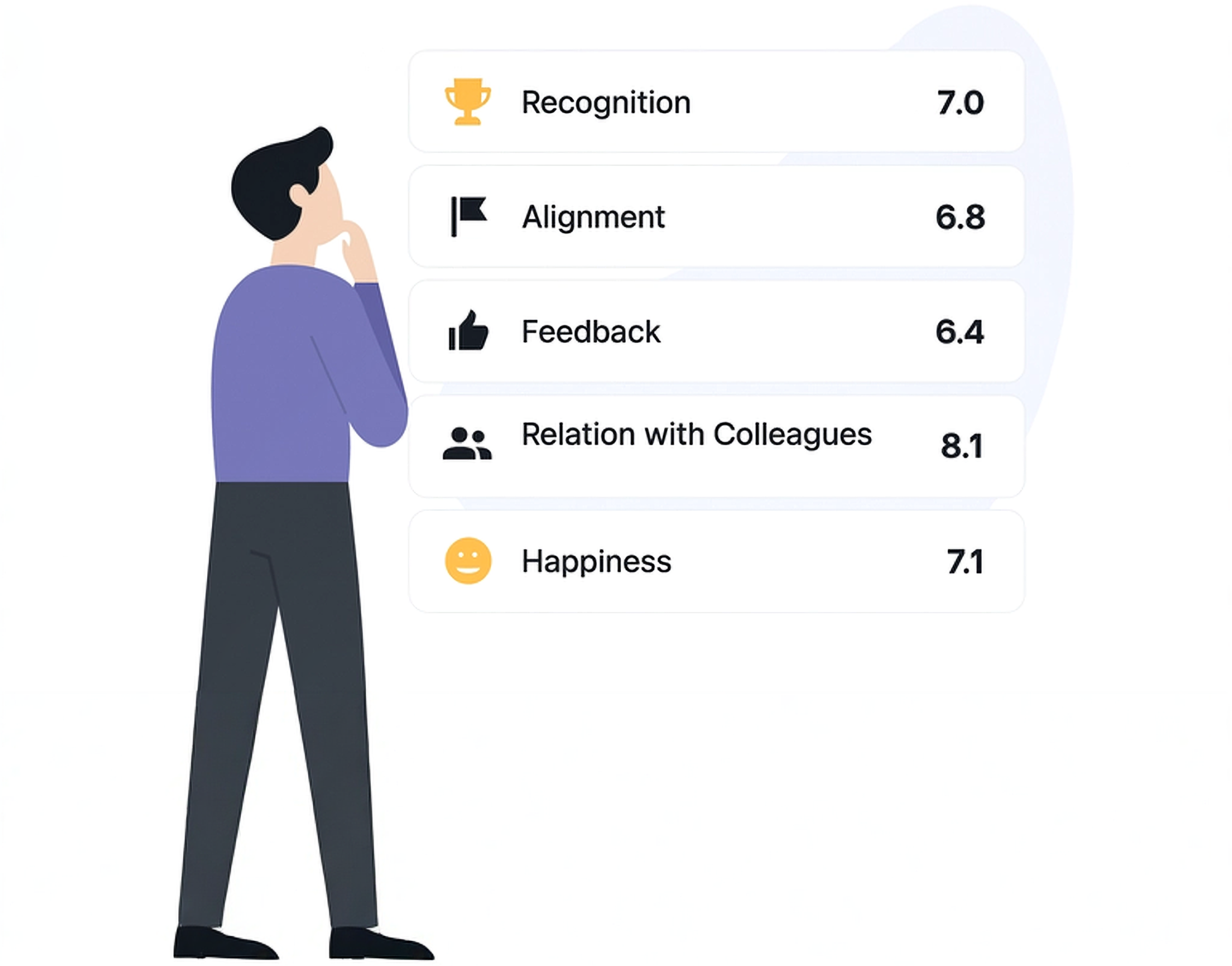 With hybrid and remote teams, informal feedback loops are disappearing. Pulse Surveys help leaders keep a real-time view on: