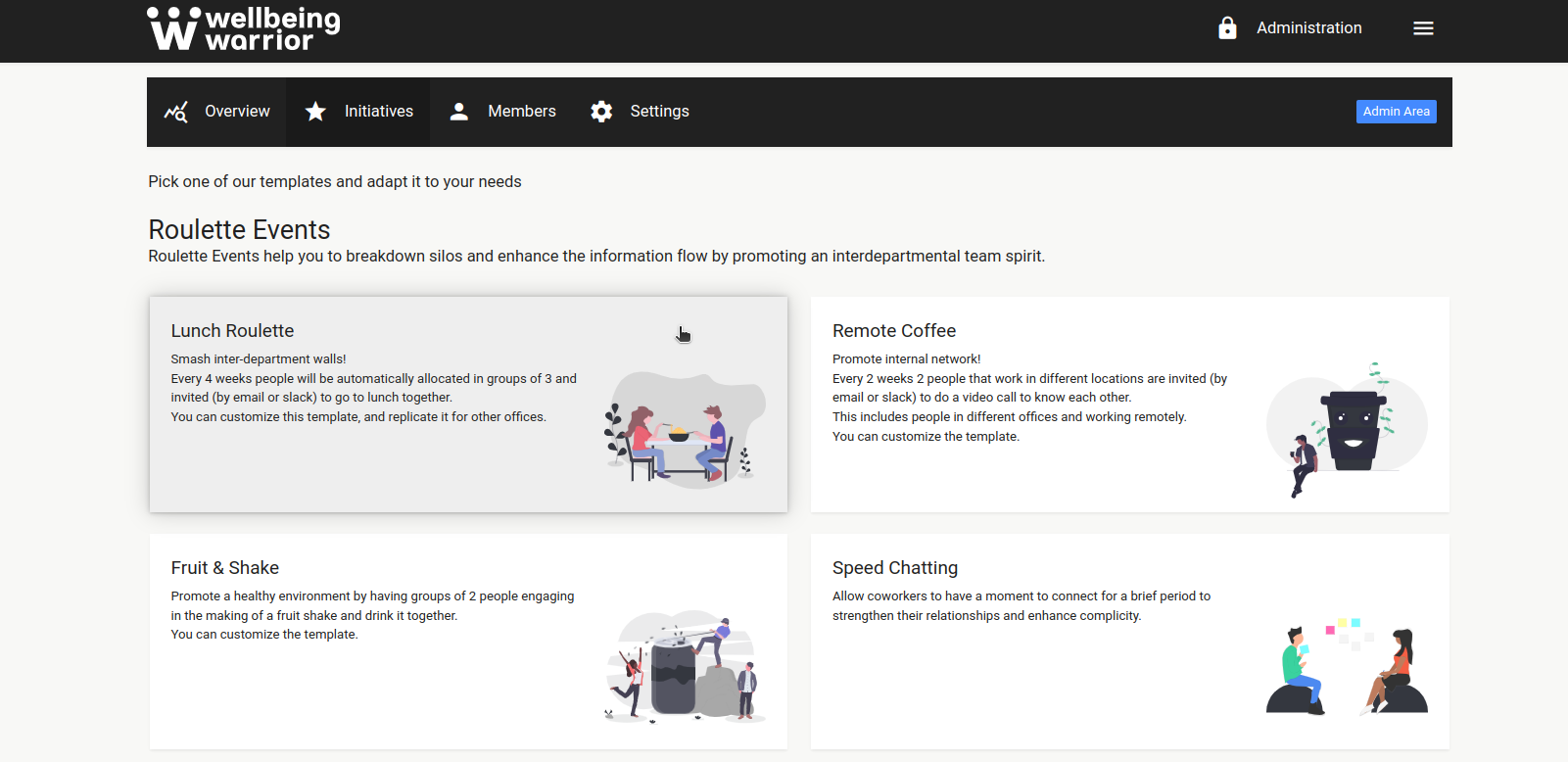 - Create or Edit an Initiative: Whether it’s a coffee break, lunch roulette, or mentorship program, start by creating or editing an initiative.